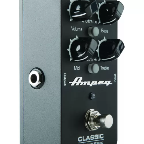 Pedal preamplificador para bajo Ampeg. La legendaria sección de previo de los Ampeg en formato pedal. Controles de volumen, graves, medios y agudos. Conmutadores Ultra-Hi y Ultra-Lo como en los originales. Muy baja relación señal / ruido. Funciona a pilas o alimentador de 9V (no incluida). True bypass
