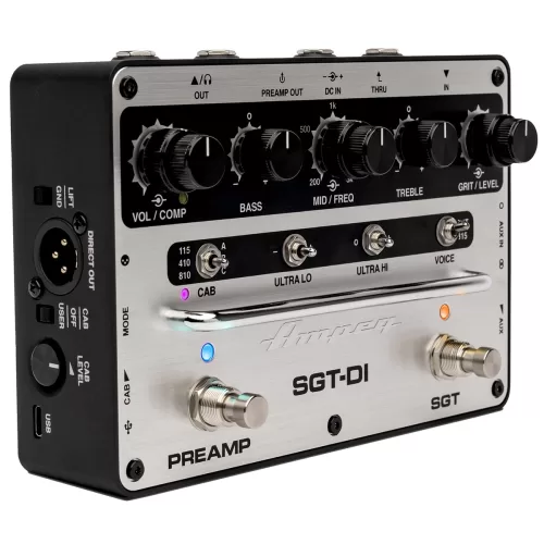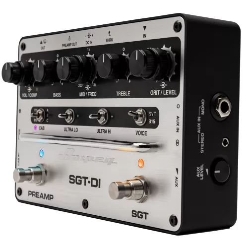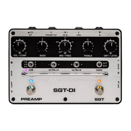 El preamplificador SGT-DI nos quiere ofrecer en un solo pedal todo el sonido Ampeg. Con su circuito Overdarive Super Grit Technology™ mejorado nos da la posibilidad de tener los tonos icónicos de los Ampeg SVT® y B15. Si le añadimos un versátil ecualizador de 3 bandas con control de frecuencias de medios, sus míticos interruptores Ultra-Hi y Ultra-Lo de 3 vías, un compresor variable con ratio10:1 y una completa sección de entradas y salidas (entrada auxiliar, salida de auriculares, Di …) tenemos un gran previo. Pero todavía falta lo mejor se ha añadido el primer simulador de cabina/cargador IR de Ampeg. Elija entre tres cabinas de fábrica clásicas o hasta tres pantalla propias utilizando la aplicación gratuita Ampeg IR Loader. Combinando el tono Ampeg probado con capacidades modernas, el SGT-DI demuestra nuestro compromiso de honrar nuestro legado y al mismo tiempo satisfacer las necesidades de los músicos contemporáneos.