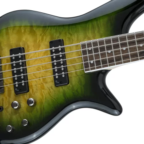 El Spectra Bass JS3QV proporciona un sonido que es tan único como el bajista que lo toca. Ya sea funk, hard rock o gospel, las pastillas humbucking dobles pasivas Jackson de salida media crean un monstruoso gruñido de gama baja, mientras que un puente HiMass™ proporciona una estabilidad mejorada, un sustain mejorado y un tono más audaz. El tono se puede refinar y ajustar aún más con un interruptor de palanca de dos vías para la división de la bobina de pastilla, ecualizador de 3 bandas (solo activo), control de mezcla y control de volumen (con selector de empuje / tracción para omitir o activar el circuito activo para el ecualizador de 3 bandas). Con el selector de empuje/tracción, nunca tendrás que temer que la batería se agote y pierda el sonido. Un tirón rápido de la perilla de volumen evitará el circuito activo, lo que facilita la recuperación del sonido de los graves sin el uso de la batería.