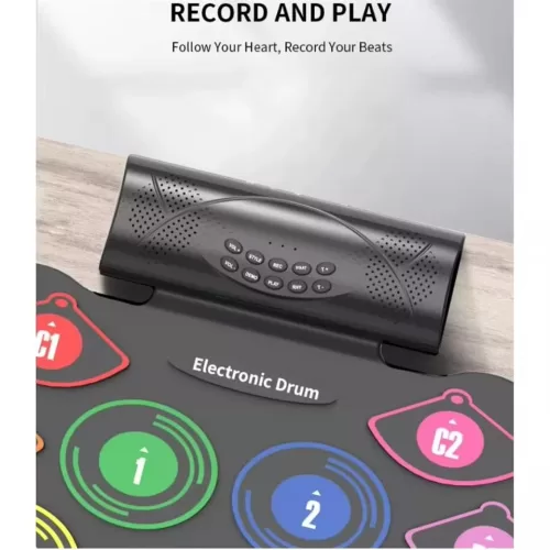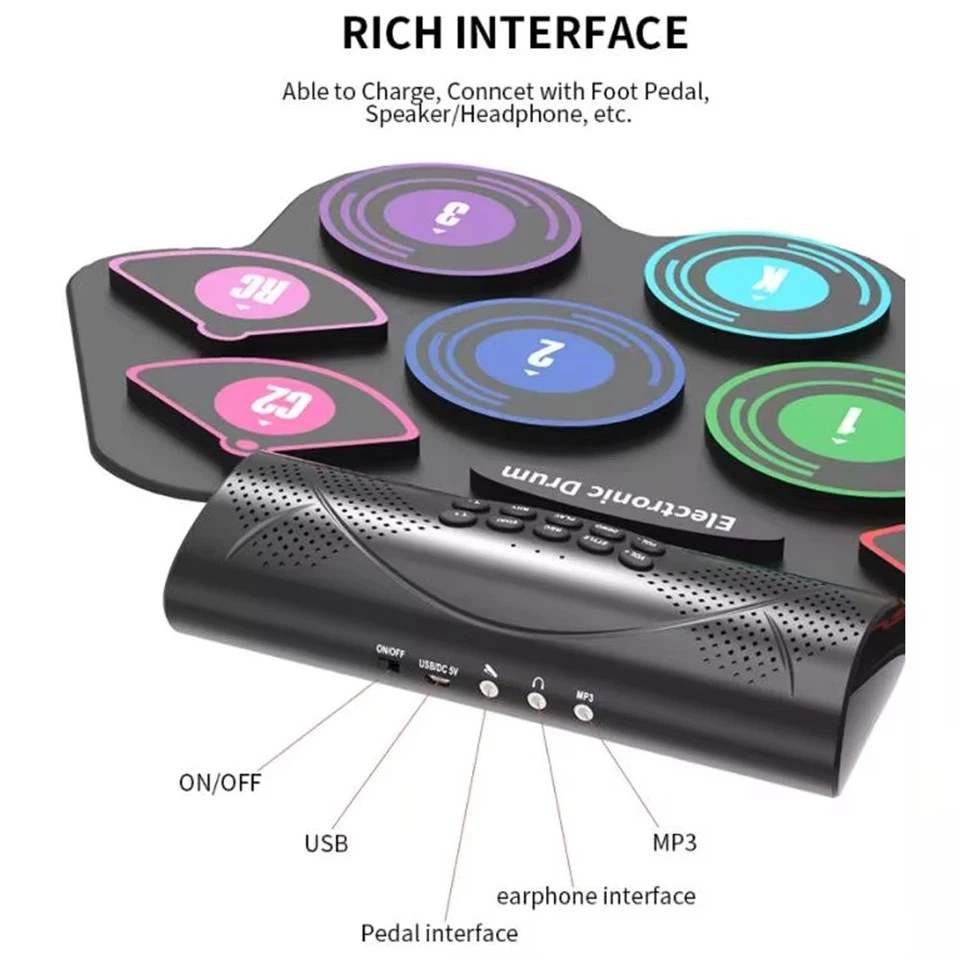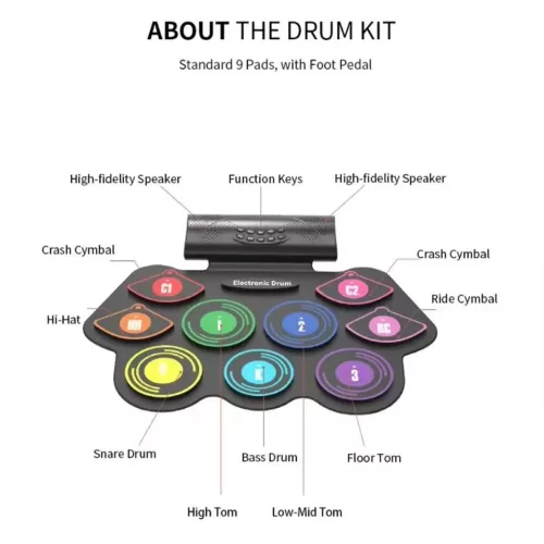 El juego de batería electrónica enrollable de 9 pads incluye bombo, tom, caja, hi-hat, platillo de choque y 2 pedales; Incluye 10 canciones de demostración, 7 tonos, 10 ritmos. Perfectos pads de batería para principiantes.