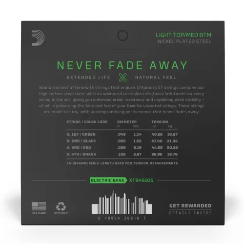 D’Addario XTB45105, XT Bass Nickel Plated Steel, calibre fino en agudas/medio en graves, escala larga, 45-105.Las cuerdas D’Addario XT Bass Nickel Plated Steel combinan nuestra aleación para bajo eléctrico más popular con un tratamiento avanzado de resistencia a la corrosión en cada cuerda del juego, preservando el tono natural y el tacto de las cuerdas no recubiertas. Disponibles en varios calibres para bajos de 4 y 5 cuerdas de escala larga. .Las cuerdas D’Addario XT tienen núcleos de acero al carbono con un tratamiento avanzado anticorrosión en cada cuerda del juego, lo que le proporciona una mayor resistencia a la rotura y una estabilidad en la afinación imbatible, todo ello conservando al mismo tiempo el tono y el tacto de sus cuerdas no recubiertas favoritas. Estas cuerdas están hechas para durar, con un rendimiento sin fisuras que nunca se apaga.Las cuerdas XT cuentan con un tratamiento de larga duración en cada cuerda del juego, preservando el tono natural y el tacto de las cuerdas no recubiertas..El alambre de acero al carbono y las tecnologías Fusion Twist proporcionan una estabilidad de afinación y una resistencia a la rotura inigualables. Las cuerdas se mantienen afinadas un 131 % mejor que las cuerdas tradicionales.Estas cuerdas están diseñadas para bajos de escala larga (+ de 34″) y tienen un acabado cónico a 36 – 7/8″.Las cuerdas duran al menos 4 veces más que las cuerdas tradicionales sin recubrimiento..El embalaje interior tiene un cierre de cremallera que se puede volver a cerrar, para facilitar la apertura y el almacenamiento de las cuerdas no utilizadas..