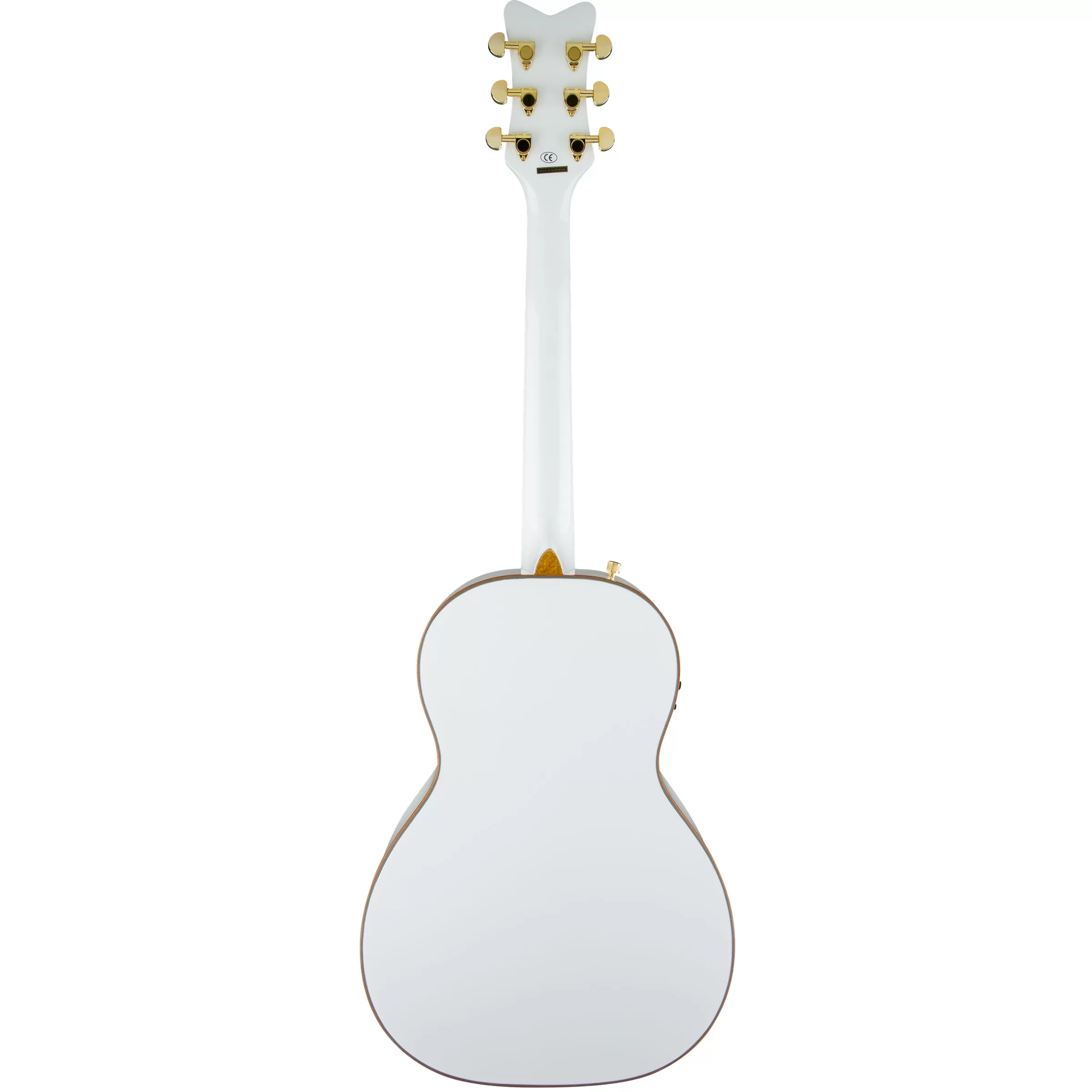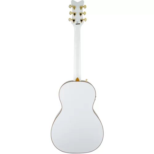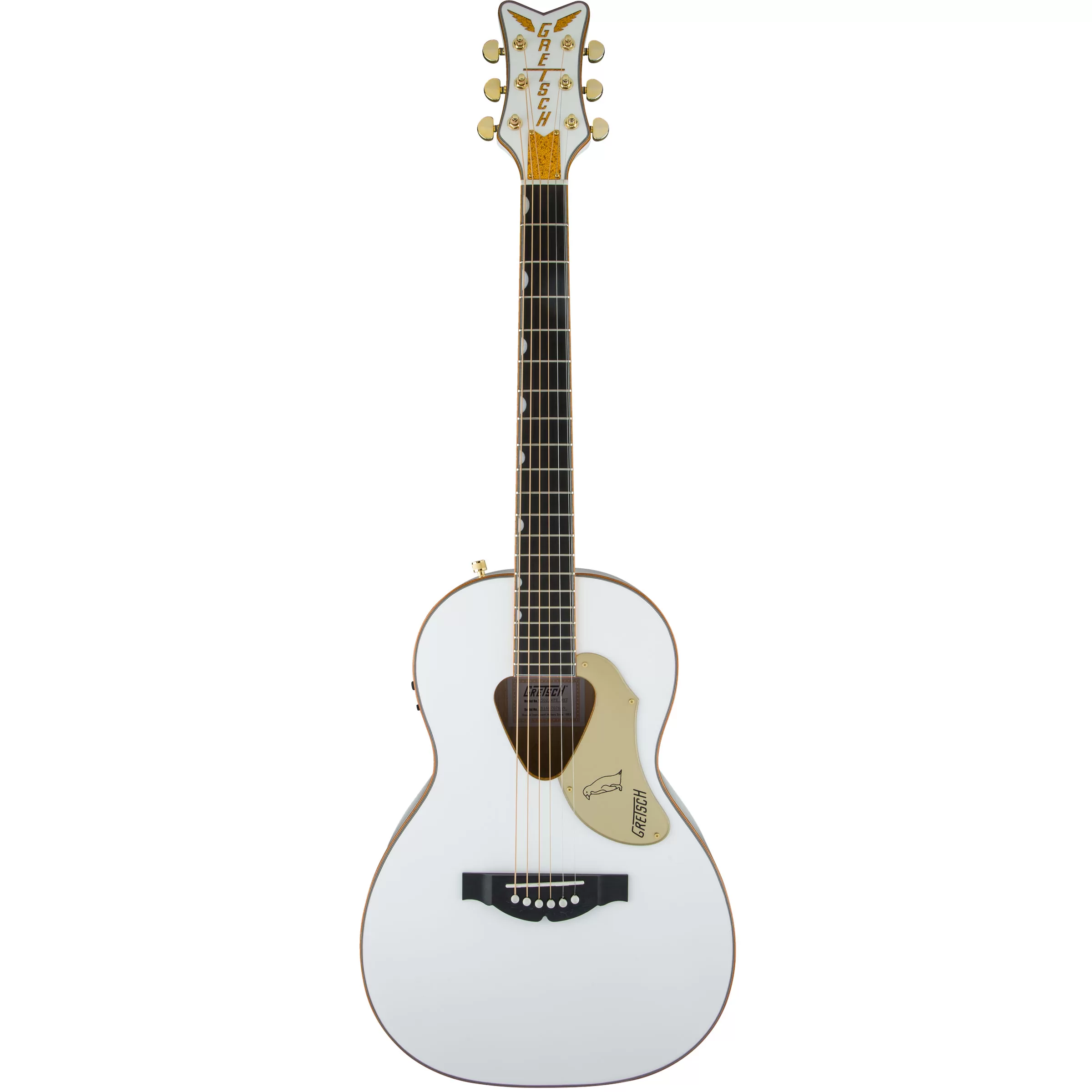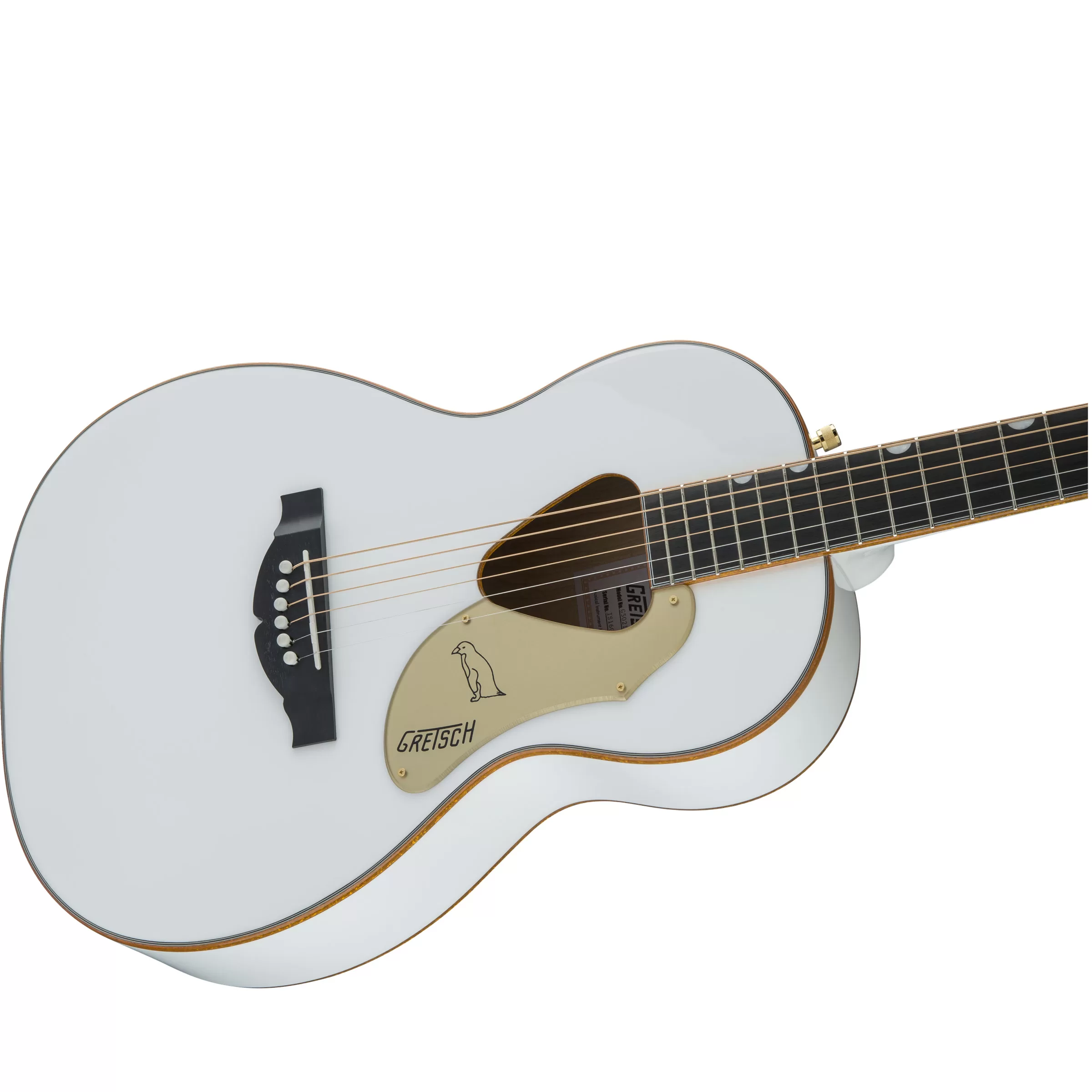 El sistema de pastilla/preamplificador Fishman® Presys III proporciona un complemento sonoro moderno a los toques clásicos, como una tapa de abeto macizo con fondo y aros de arce, mástil de caoba, diapasón de laurel de 12″ de radio con 20 trastes de estilo vintage, incrustaciones de miniaturas neoclásicas™ perladas y cejuela de hueso sintético, puente de laurel, encuadernación con destellos dorados y ala vertical “Logotipo de clavijero Gretsch”, golpeador de plexiglás dorado, herrajes de oro, y más.