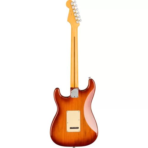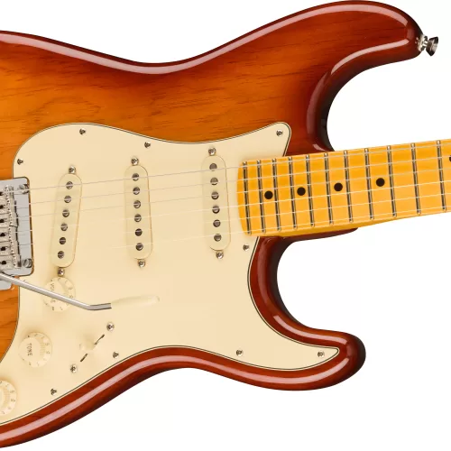 “La American Professional II Stratocaster® se basa en más de sesenta años de innovación, inspiración y evolución para satisfacer las demandas del músico de hoy en día. Nuestro popular mástil “Deep C” ahora tiene bordes de diapasón redondeados, un acabado satinado “Super-Natural” y un talón de mástil recién esculpido para una sensación sumamente cómoda y de fácil acceso al registro superior. Las nuevas pastillas de bobina simple V-Mod II Stratocaster son más articuladas que nunca y conservan la calidez y el timbre de campana. Un trémolo mejorado de 2 puntos con un bloque de acero laminado en frío aumenta el sustain, la claridad y el brillo de alta gama. La American Pro II Stratocaster tiene al sonido y sensación clásicos pero con amplias mejoras que se suman a las habituales para marcar un nuevo estándar para instrumentos profesionales “.
