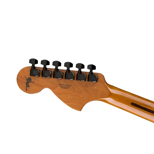 Diseñada sobre un cuerpo semihueco, la Starcaster® Tom DeLonge recurre para su sonido a una pastilla de tipo humbucker Seymour Duncan® SH-5 Duncan Custom™. Con ella, se consigue un tono poderoso, perfecto para tocar acordes potentes y grandes riffs. Pero no todo es contundencia sonora. La electrónica se controla desde un único Master volume, combinado con un circuito treble bleed, que respeta en todo momento la presencia de agudos. Este circuito les garantiza a los/las guitarristas desde sonidos limpios cristalinos, hasta grandes distorsiones con un buen control dinámico. El mástil en forma de “modern C” se ve acompañado de un diapasón de palisandro con un radio de 12″ (304,8 mm) y trastes medium jumbo. Por tanto, es un instrumento con un tacto suave y pensado para el músico moderno. La estabilidad de afinación está garantizada gracias a los clavijeros Fender con bloqueo y al puente totalmente ajustable de tipo stop tailpiece. La firma original de DeLonge aparece en la parte trasera de la pala. En la placa de unión del mástil con el cuerpo se ha añadido una ilustración especial.
