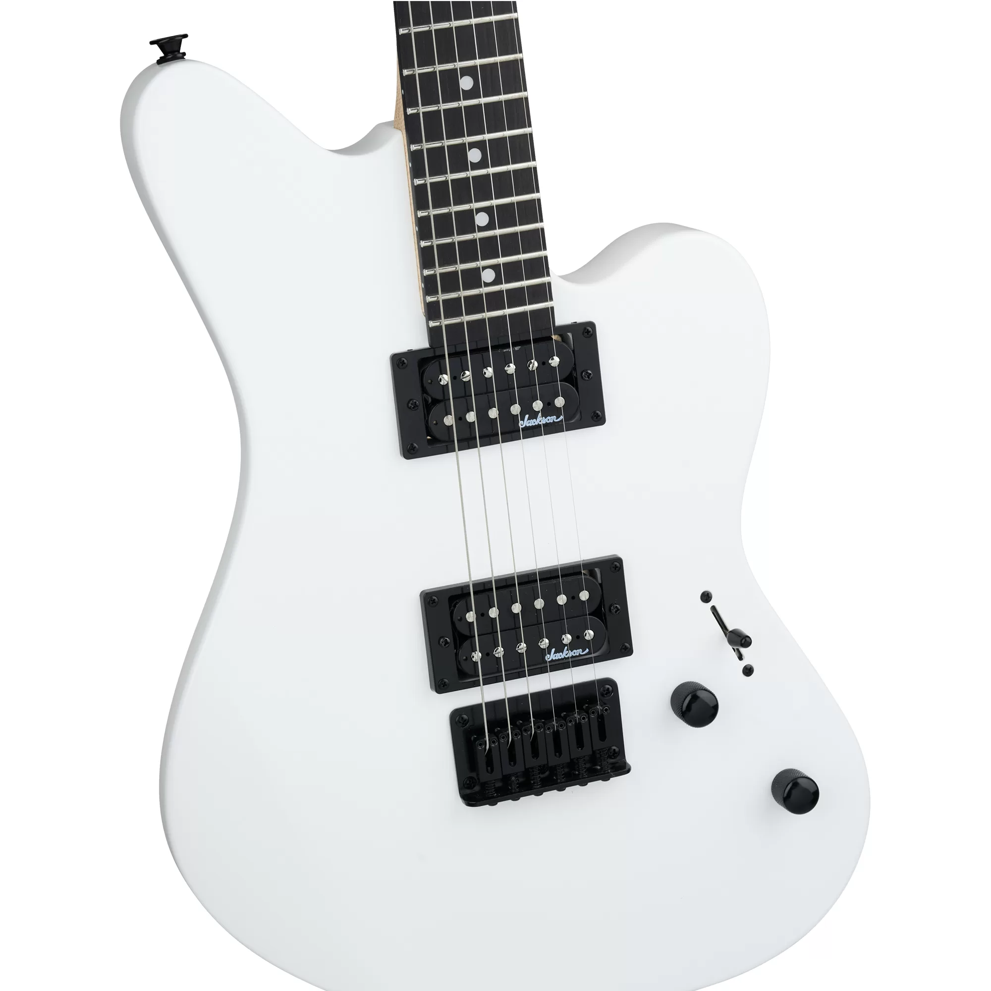 Este modelo cuenta con un cuerpo de álamo con diseño offset y un mástil atornillado de arce ofreciendo una base sólida. El diapasón de amaranto con radio compuesto de 12″-16″ (305 – 406 mm) con ribete facilita la ejecución de acordes y permite realizar solos con total comodidad. Los 22 trastes jumbo y el talón esculpido de Jackson reemplazan la tradicional placa de mástil para ofrecer acceso sin límites a las notas más agudas.