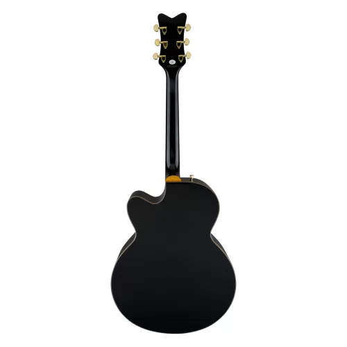 Su enorme cuerpo con cutaway incluye un deslumbrante broche dorado en la parte superior, trasera, agujero de sonido, diapasón y cabezal. Otras características de primera calidad incluyen una tapa de abeto macizo con orejeras “X” festoneadas y el clásico orificio triangular de sonido Rancher, lados de arce y espalda arqueada, mástil de caoba, diapasón de palisandro con 21 trastes con incrustaciones de miniaturas Neo-Classic™, cabezal en forma de V Con el logotipo brillante “Gretsch” de alas verticales, puente compensado con base de palisandro, sintonizadores de lujo y herrajes dorados.