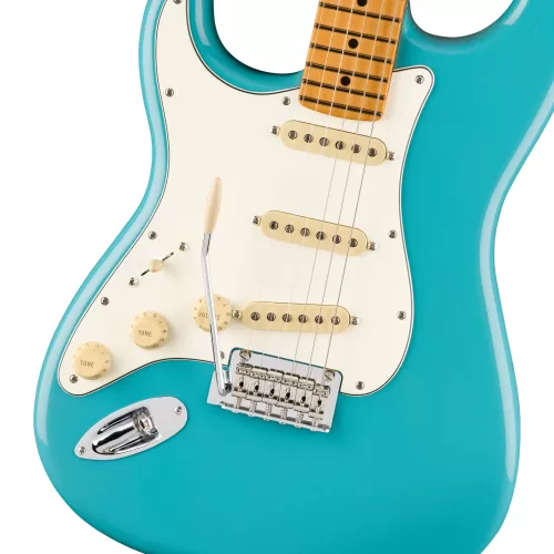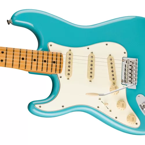 La Stratocaster® Player II captura el encanto clásico de Fender, pero en su interior, está diseñada para satisfacer las demandas de los/las músicos hoy en día. El mástil está meticulosamente diseñado para una ejecución ágil y fluida, con un perfil en forma de Modern “C” y un acabado suave de uretano satinado en la parte posterior, junto con un diapasón de palisandro o arce de 9,5″ (241,3 mm) de radio, bordes suaves y 22 trastes medium jumbo. Elige entre cuerpos de aliso, fresno con cámaras acústicas o caoba con cámaras acústicas disponibles en acabados clásicos de Fender y en colores inéditos recuperados de los archivos históricos.