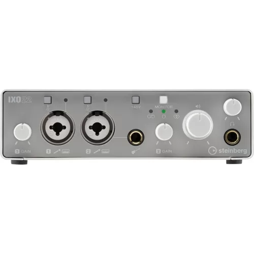 Interfaz de Audio Steinberg IXO 22 White – USB 2.0 de 24 bits/192 kHz con USB-C. Dos entradas combinadas, una entrada Hi-Z y dos salidas de línea TRS. Dos preamplificadores de micrófono Clase A con alimentación de +48 V. Salida de auriculares con control de volumen individual. Monitoreo directo sin latencia de la señal de entrada. Función loopback para transmisión en vivo por Internet. Compatibilidad multiplataforma con Windows, macOS, iPad y iPhone. Alimentación por USB para grabaciones móviles con Mac y PC, toma USB-C adicional para fuente de alimentación cuando se usa con iPad o iPhone. Carcasa metálica compacta y liviana. Incluye Cubase AI DAW para Mac y PC y la aplicación Cubasis LE para iOS