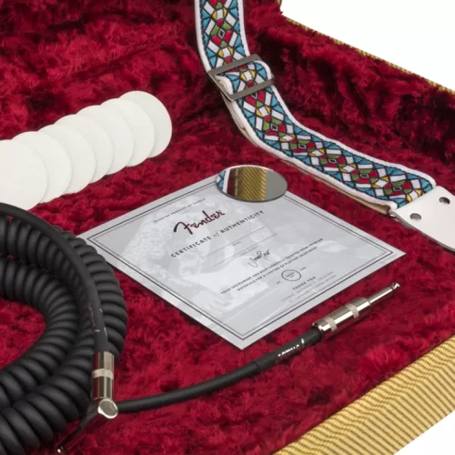Creado en conjunción con Page, la Jimmy Page Telecaster también cuenta con algunos toques personalizados, como la firma de Jimmy Page en la pala y en la placa del mástil personalizada. En el estuche vintage de tweed se incluyen ocho espejos redondos (un tributo al tratamiento personalizado que luego se aplicó a la guitarra), un cable negro enrollado, una correa estilo vintage “stained glass” y un certificado de autenticidad personalizado. Acerca de su amada Telecaster, Jimmy dijo: ” Realmente la hice mía, es una guitarra mágica “.
