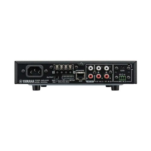 Amplificador-mezclador de clase D con selección de baja impedancia/alta impedancia (baja impedancia: 30 W x 2 canales, alta impedancia: 60 W x 1 canal), equipado con 3 tipos de entradas estéreo seleccionables, 2 entradas de micrófono y potentes funciones DSP para reproducir música con gran calidad y utilizarlo con un micrófono.