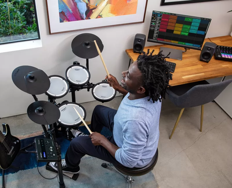 Melodics es una app de ordenador que se conecta con tu V-Drums. Toca con pistas y lecciones divididas por pasos para aprender nuevos patrones, desarrollar tu sentido del tempo y del ritmo, grabarte y descubrir qué mejorar con la función de reproducción. Puedes tocar las 40 lecciones gratuitas todas las veces que quieras, son gratis para siempre, y si quieres más, puedes suscribirte y acceder a lecciones sin límite. Las sesiones de práctica rutinarias son cosa del pasado. Descárgate Melodics, conecta tu TD-07KV y pásatelo en grande baqueta en mano y pedal en pie.