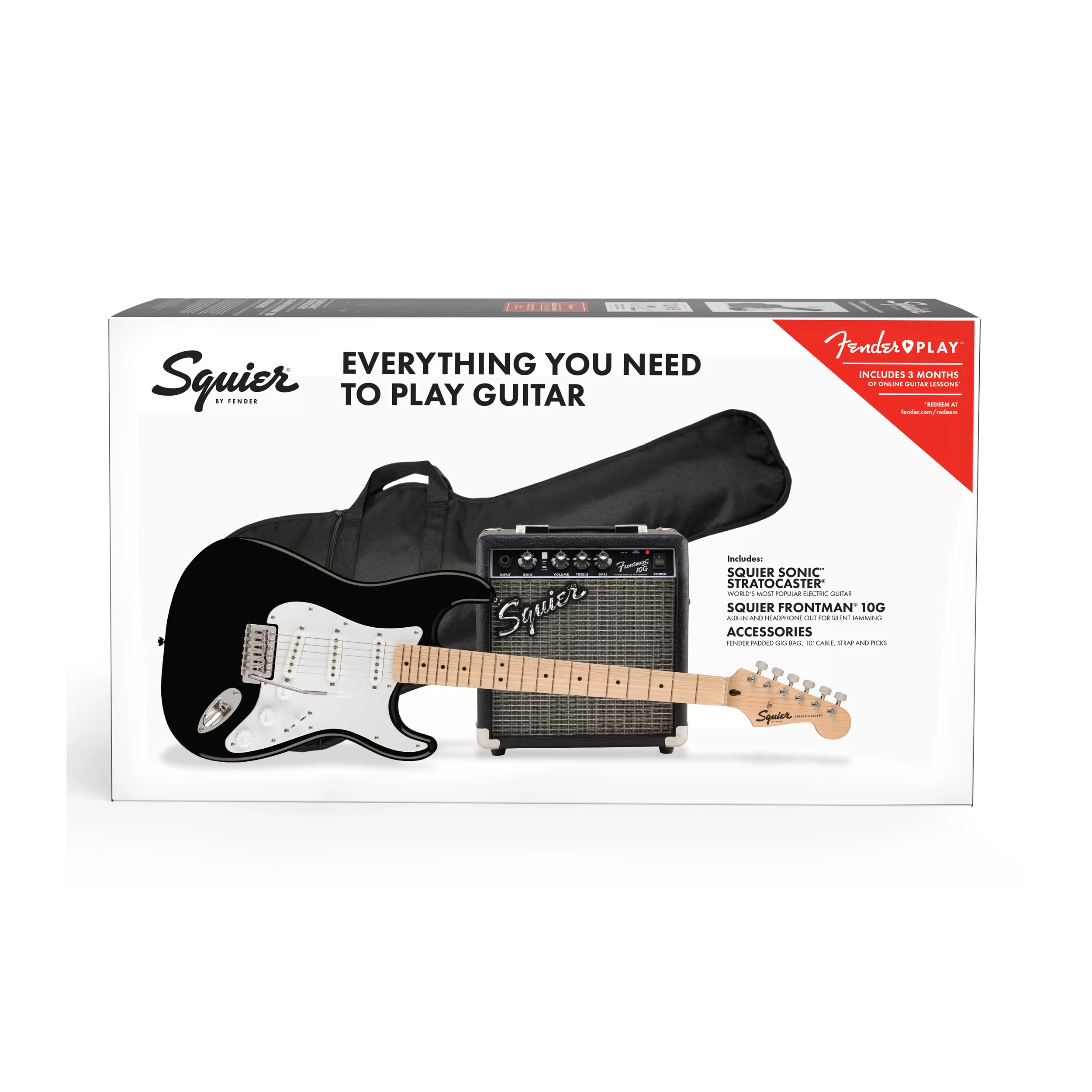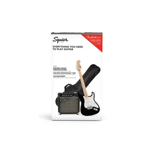 El Squier Sonic® Stratocaster® Pack está listo para lanzar cualquier aventura musical a la velocidad de la luz, ofreciendo a los nuevos músicos una conveniente colección de elementos esenciales de guitarra en un solo pack. Un ícono de la historia de la música y una excelente opción para los principiantes, la Stratocaster es reconocida por su elegante y cómodo cuerpo contorneado y su mástil delgado y fácil de tocar. Tres pastillas de bobina simple producen un tono inspirador y versátil perfecto para cualquier género musical y un puente de trémolo invita a efectos de vibrato expresivos que seguramente despertarán la creatividad. El amplificador Squier® Frontman® 10G compacto y portátil cuenta con canales limpios y overdrive, ecualizador de dos bandas para control de tono, conector para auriculares para practicar en silencio y una entrada auxiliar para conectar un dispositivo multimedia. También se incluyen una funda acolchada, cable de instrumento, correa y púas, así como una suscripción gratuita de 3 meses a Fender Play®, la forma más fácil de aprender a tocar la guitarra.